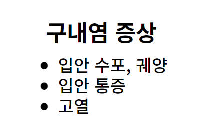구내염에 걸리면 혀와 잇몸, 입술과 볼 안쪽에 물집이 발생하고 통증이 발생합니다. 심한경우 고열이 날 수 있으며 입안의 통증으로 인해 음식물을 섭취하기 힘들고 말할 때도 통증이 발생합니다.